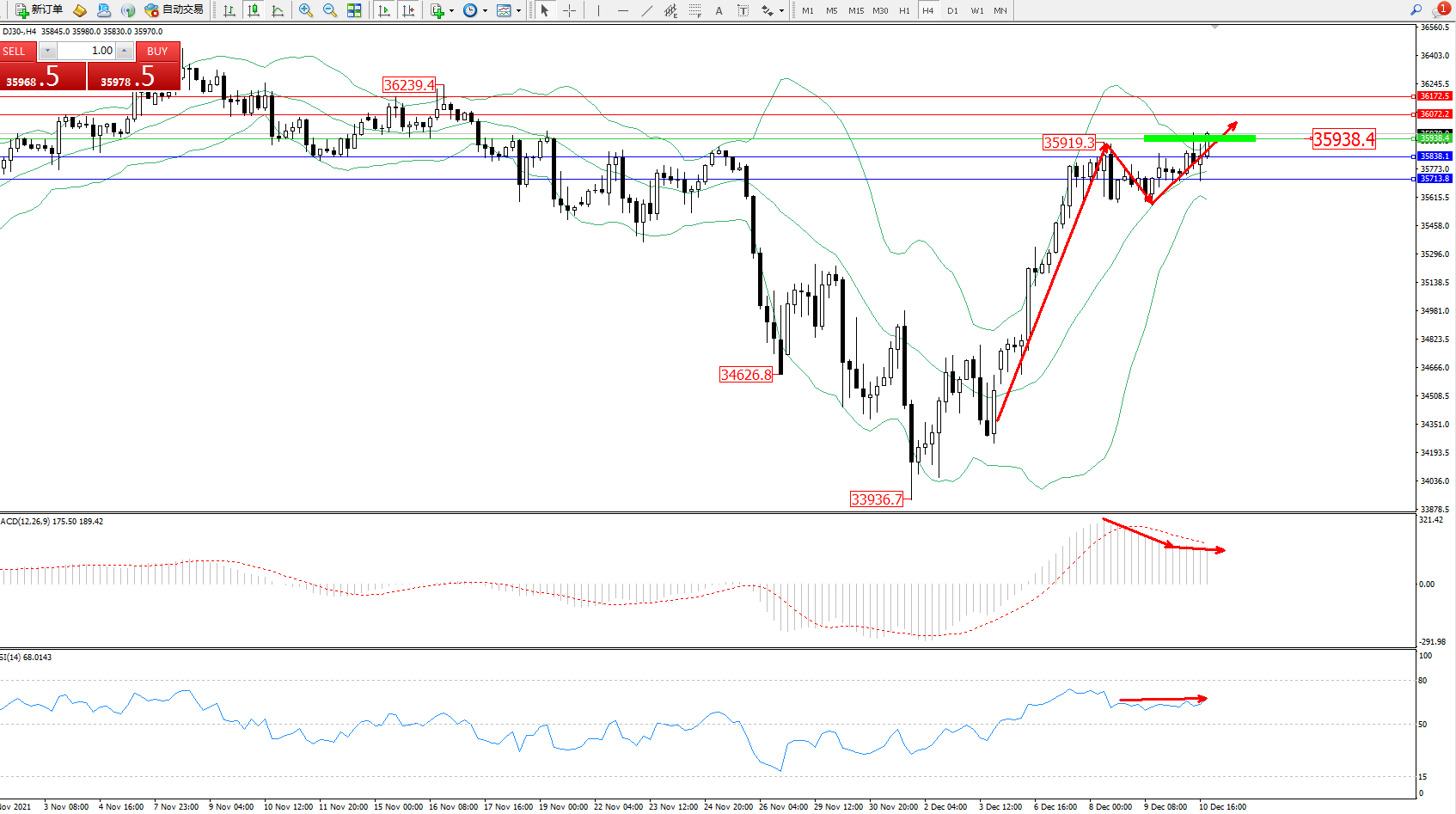 技术点评:多头动力延续布林带指标上轨附近持续震荡上扬,高位抵达35919位置遇阻开始整理平移,短期多头动力再度上扬,突破前高后开始再度震荡向上移动,布林带指标呈收口走势开始缓慢张口,MACD指标处于多头区域维持整理平移,RSI指标处于多头区域持续整理平移;