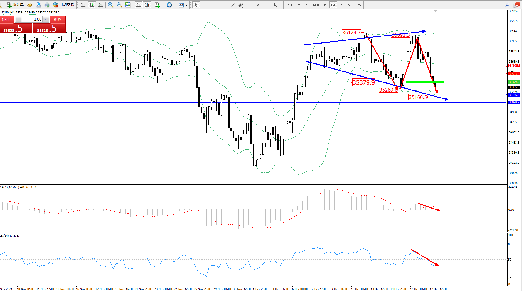 技术点评:长时间维持在布林带指标通道内,呈喇叭三角形态扩大波幅,高位空头动力继续震荡下挫至布林带指标下轨35160位置后得到支撑,布林带指标呈张口走势态势良好,MACD指标空头动力维持震荡下行至0轴线下方徘徊,RSI指标空头动力继续震荡下行至50均衡线下方不断下移;