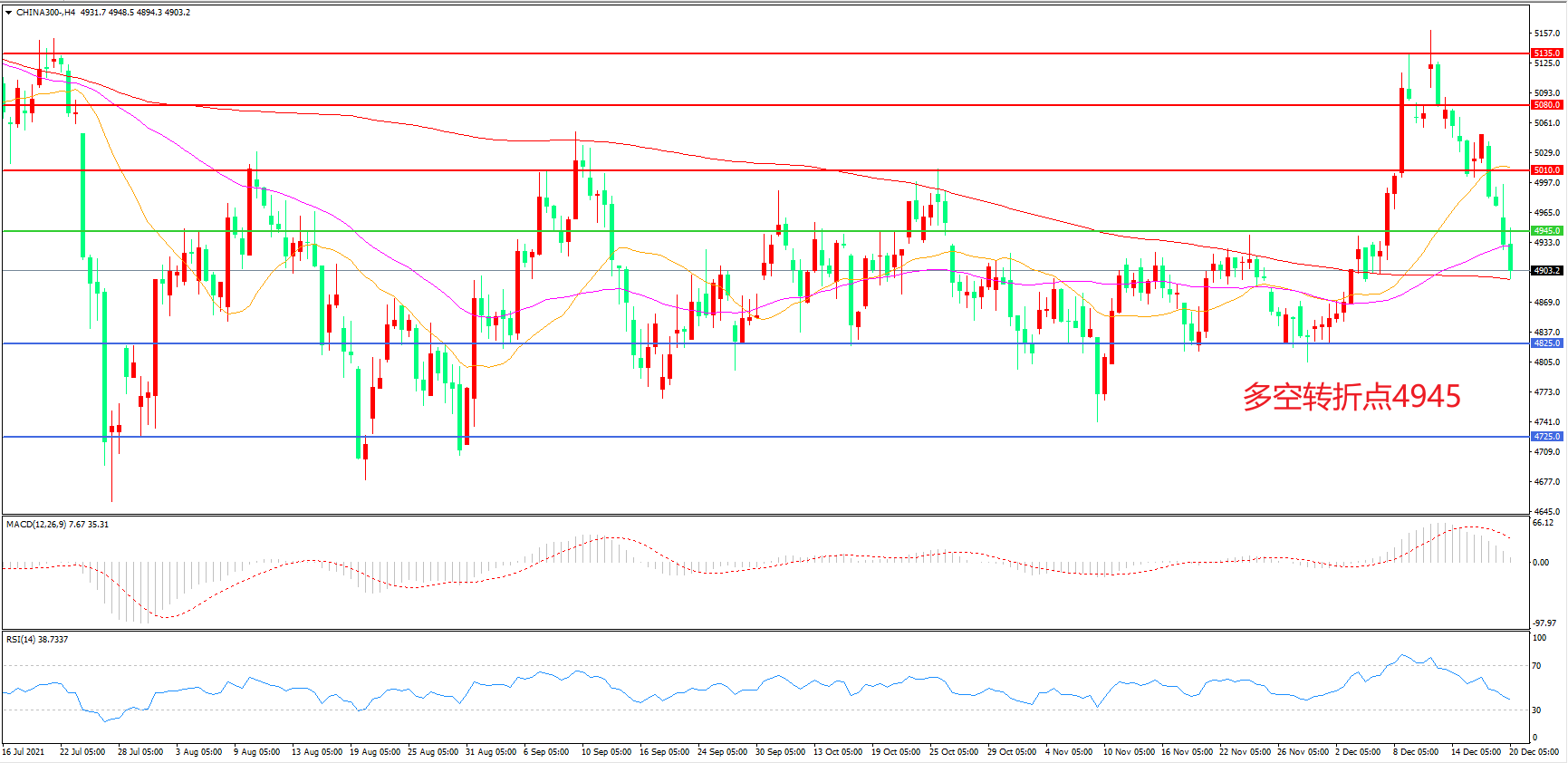 4小时图看,沪深300长阴下破,短期走势低迷,4945成为多空分水岭,200周期均线成为短期支撑, MACD红柱缩短,RSI指标走平,日内震荡下行概率较大。
