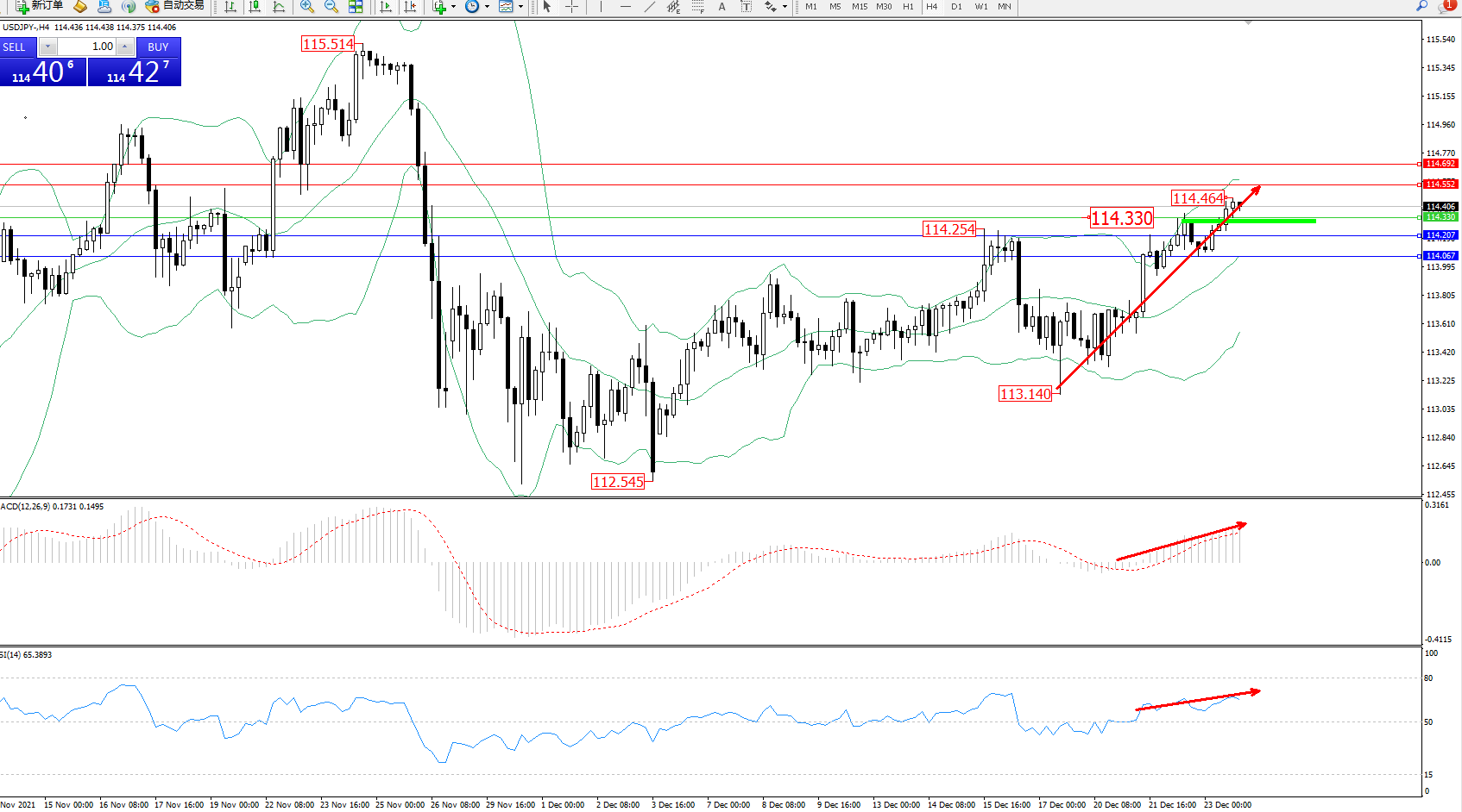 技术点评:多头动力延续布林带指标通道中上轨区间持续震荡上扬,高位抵达114.464位置短期整理,多头动力有继续攀升迹象,布林带指标呈缓慢张口走势向上移动中,MACD指标处于0轴线上方多头区域持续整理向上移动,RSI指标处于50均衡线上方多头区域持续徘徊中;