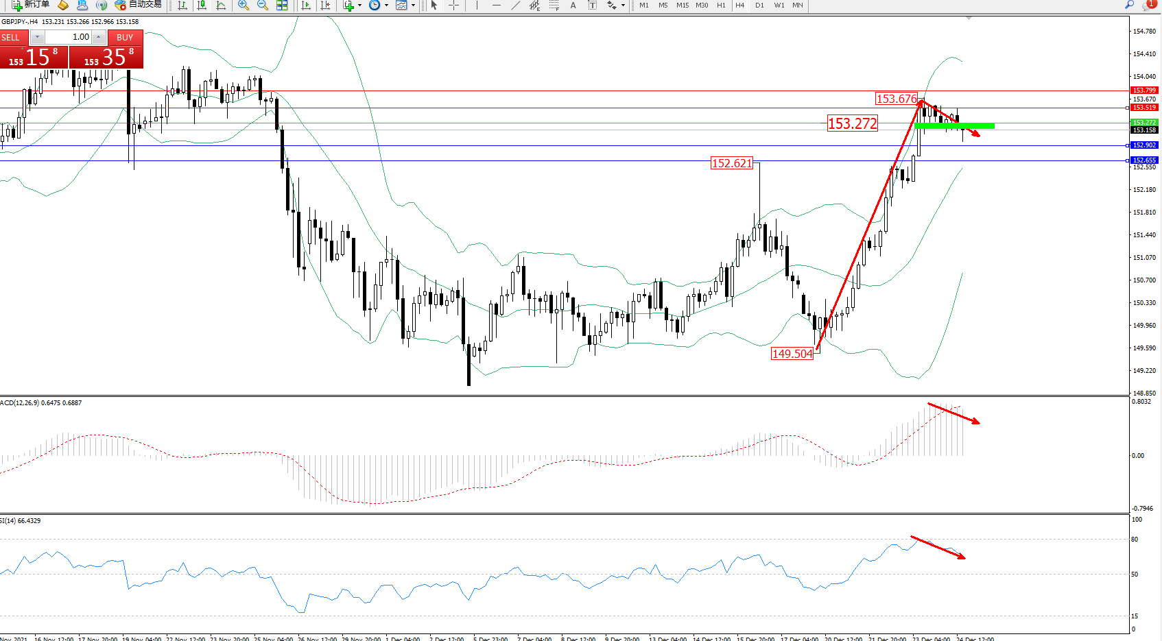 技术点评:多头动力延续布林带指标通道上轨附近持续震荡上扬,高位抵达153.676附近遇阻整理回撤,短期高位空头动力开始弱势下行,布林带指标呈收口走势中,MACD指标处于多头区域高位整理徘徊有下移迹象,RSI指标处于多头区域维持整理缓慢下行中;
