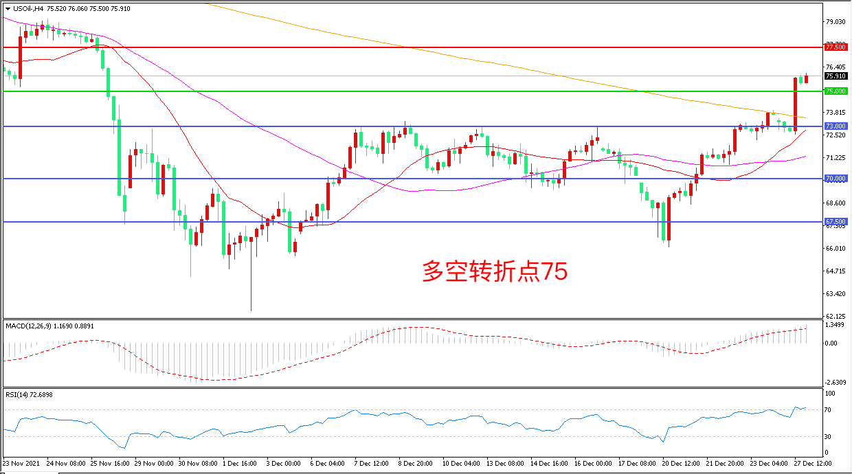 交易策略:在75.00之上看涨,目标77.50        80.00
