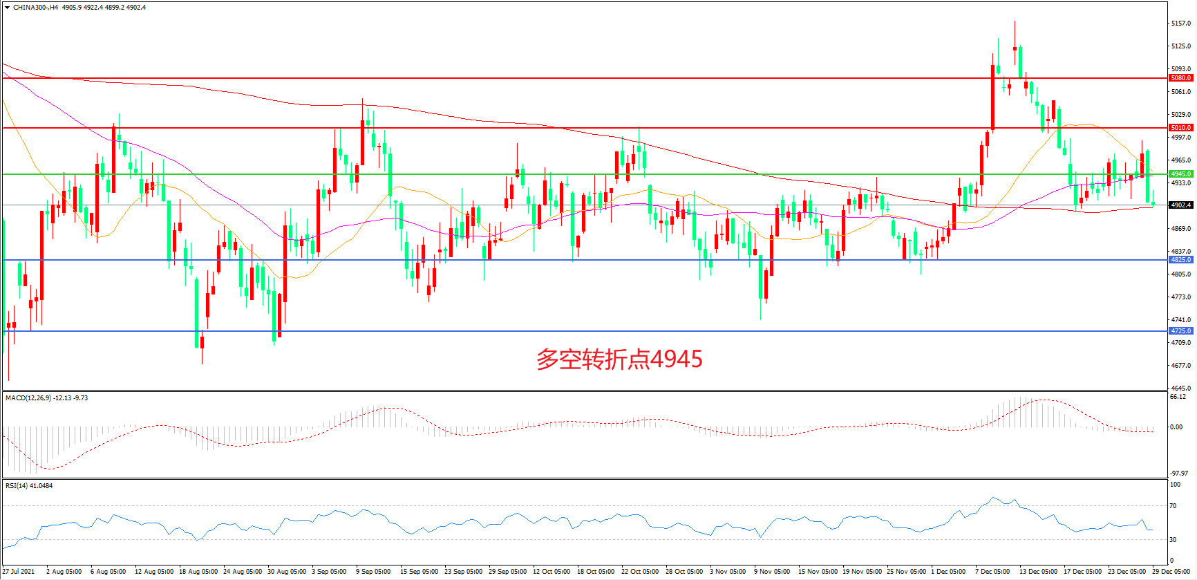 4小时图看,沪深300长阴下破,前期反弹被吞噬殆尽,4945一线被跌破,200均线成为下方支撑, MACD绿柱缩短,RSI指标走平,日内延续震荡概率较大。