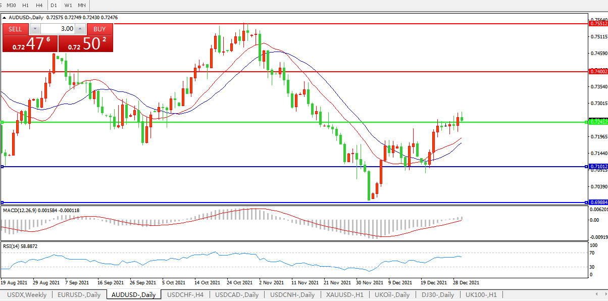 交易策略:0.7240上方看涨,目标0.7400、0.7550