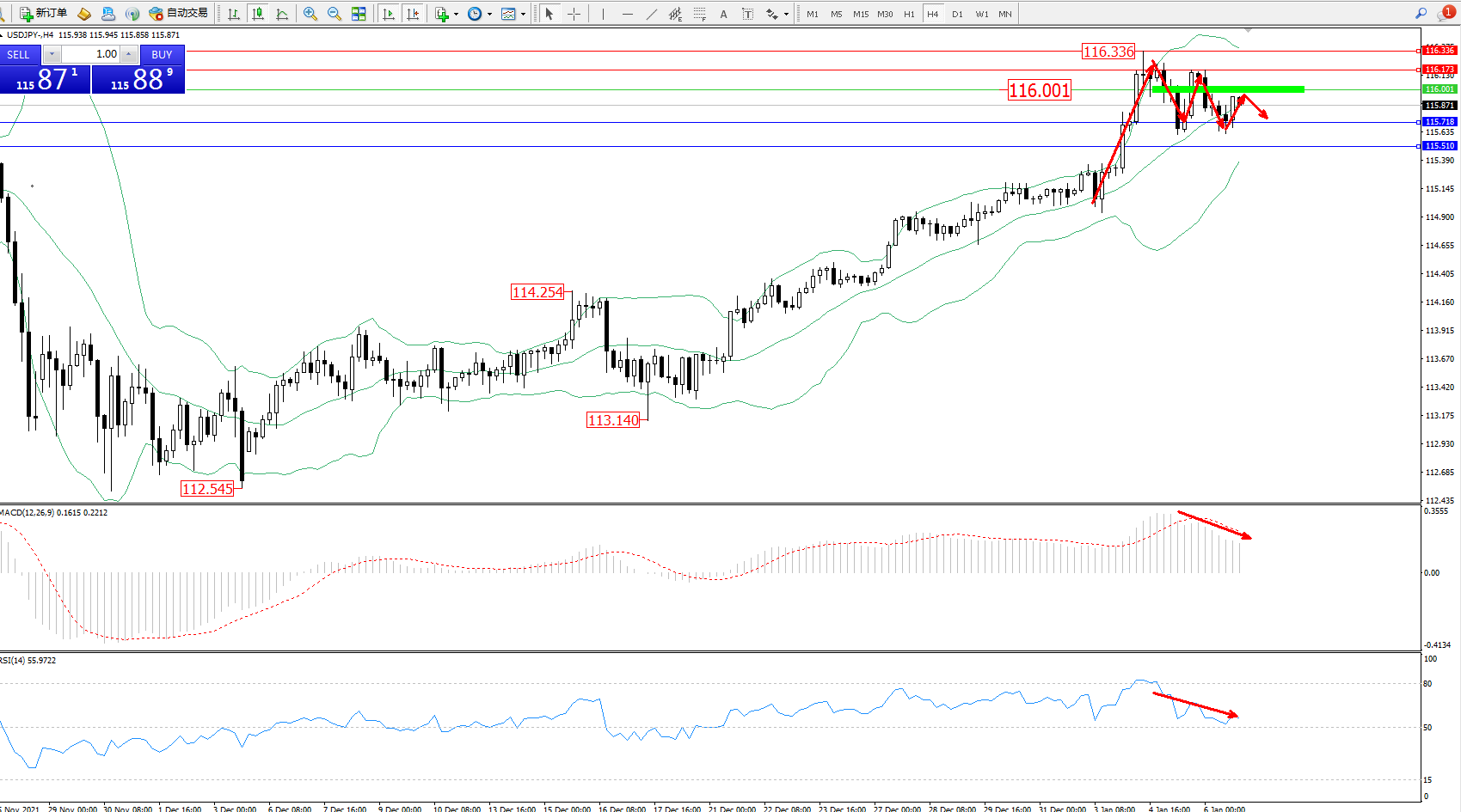 技术点评:多头动力延续布林带指标通道中上轨区间持续震荡上扬,高位抵达116.336位置后遇阻震荡回撤,纠结于布林带指标中轨附近弱势整理,短期空头动力回撤或将延续,布林带指标呈上行趋势走势后高位开始收口,MACD指标处于多头区域维持整理缓慢下行,RSI指标处于多头区域维持震荡回撤后即将触及50均衡线附近节点;