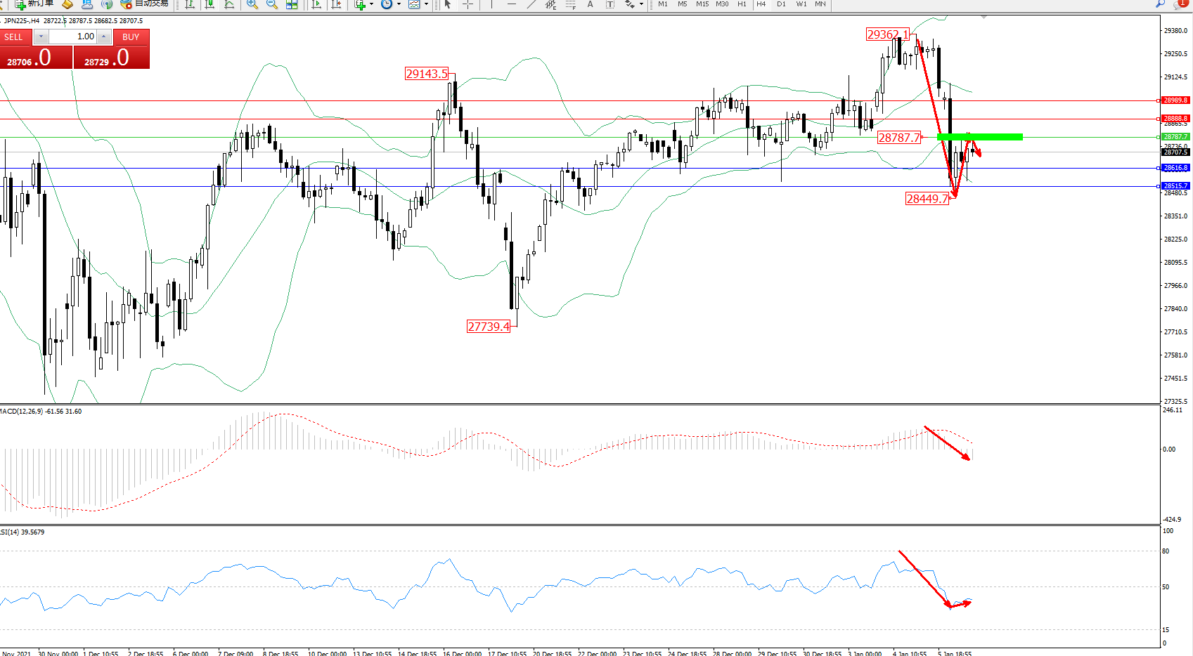 技术点评:高位空头动力急速下挫,破布林带指标下轨至28449位置附近得到短暂支撑反转震荡上移,短期多头动力有伺机入场迹象,纠结于布林带指标下轨内侧不断震荡,布林带指标呈缓慢张口走势中,MACD指标处于多头区域维持整理缓慢下行至0轴线下方徘徊,RSI指标空头动力维持震荡下行至空头区域弱势整理中;