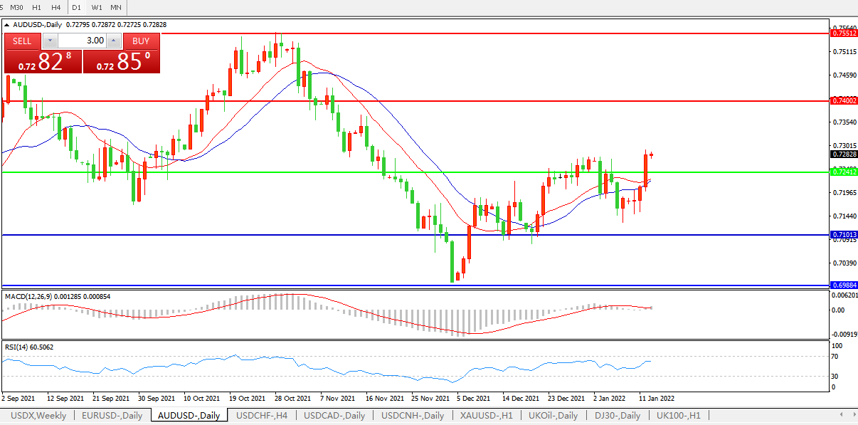 技术面简析:日图均线呈多头排列,汇价快速拉升,MACD运行于0轴上但量能不足,RSI小幅走升,预计汇价大概率将进一步上行。
