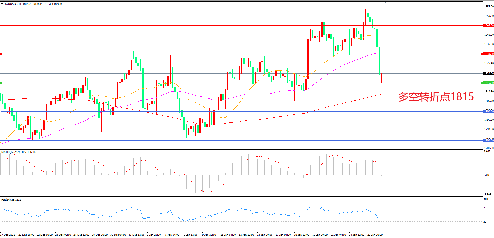 4小时图看,金价长阴连续破位,前期涨势被吞噬殆尽,1815成为多空分水岭,MACD红柱缩短,RSI指标走平,日内延续震荡概率较大。