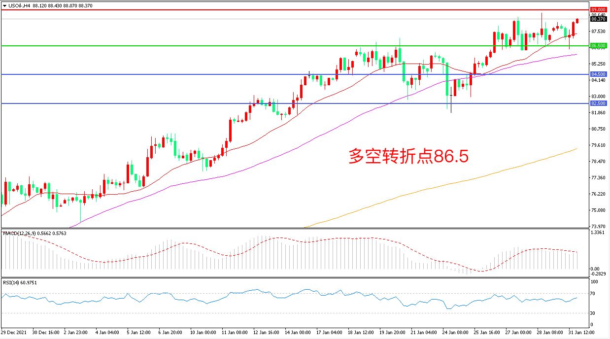4小时图看,油价延续高位调整走势,区间震荡继续明显,均线系统成为下方支撑,89美元成为上方阻力,MACD红柱增加,RSI指标走平,日内震荡上行概率较大。