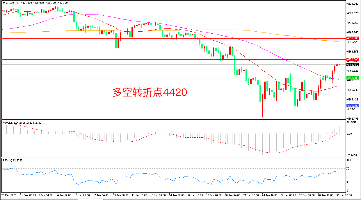 4小时图看,标普500宽幅震荡后稳步拉升,多头形态初现,4420成为多空分水岭,4520成为上方阻力,MACD红烛增加,RSI指标走平,日内震荡上行概率较大。