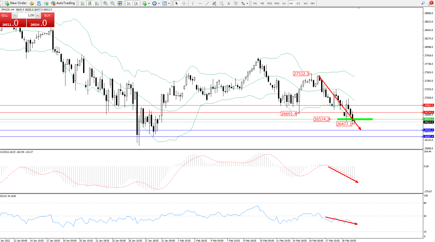技术点评:延续布林带指标通道下轨附近持续震荡下行,低位抵达26477位置附近整理,空头下行态势良好,布林带指标呈缓慢张口走势中,MACD指标处于空头区域弱势震荡向下移动中,RSI指标处于50均衡线下侧整理平移中;