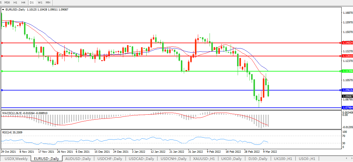欧元兑美元下滑0.63%,至1.0913,回吐隔夜交易时段的涨幅,本周小幅走低,为连续第六周下跌;3月迄今,欧元兑美元已下跌超过2.5%。在乌克兰战争引发的滞胀忧虑加剧之际,欧元周一触及近两年低位,但随后欧洲央行宣布将逐步退出刺激举措,为2022年底前升息铺平道路,欧元获得一些支撑。