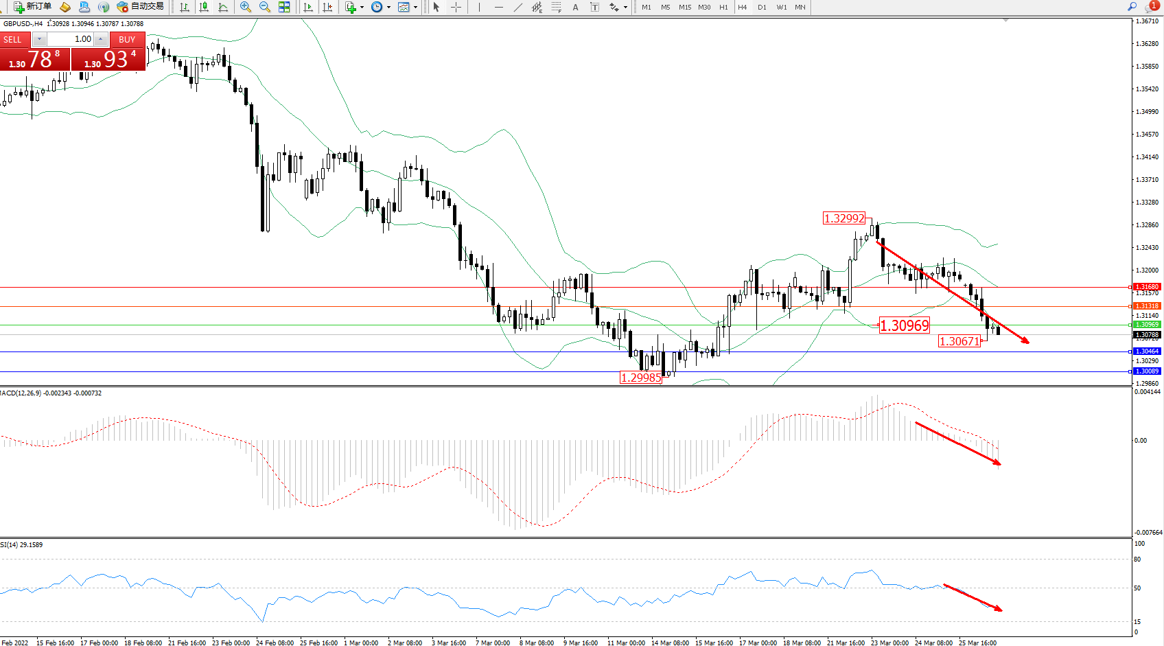 交易策略:1.30969下方看跌,目标1.30464、1.30089
