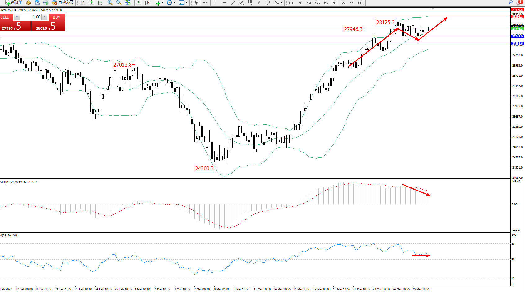 日经指数JPN225——4小时K线图显示: