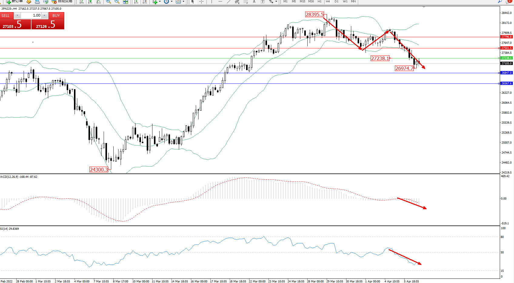 技术点评:空头动力延续不林指标通道内维持震荡下挫,低位抵达26974位置节点后整理,短期空头下行动力或将延续,布林带指标呈缓慢张口走势持续中,MACD指标处于0轴线下方维持震荡,RSI指标处于50均衡线下侧空头区域维持震荡不断下移;