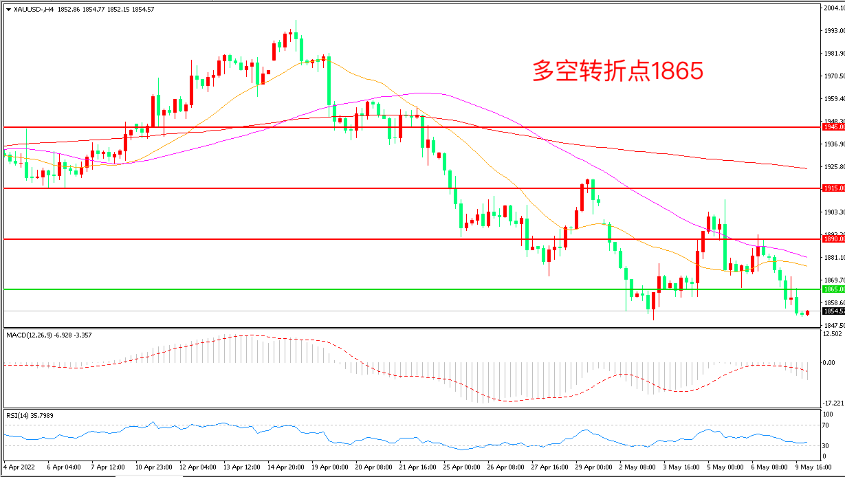 周一(5月9日),由于美元走强和美国国债收益率上升,打压了无收益资产黄金的吸引力,现货黄金大跌近30美元,收报1853.36美元/盎司。短期看,美元不会很快就大幅逆转,这也是市场的主流方向,在2020年3月疫情爆发初期,黄金价格就曾随着美股的暴跌而大幅下跌,短期看看,金价仍将维持低迷表现。