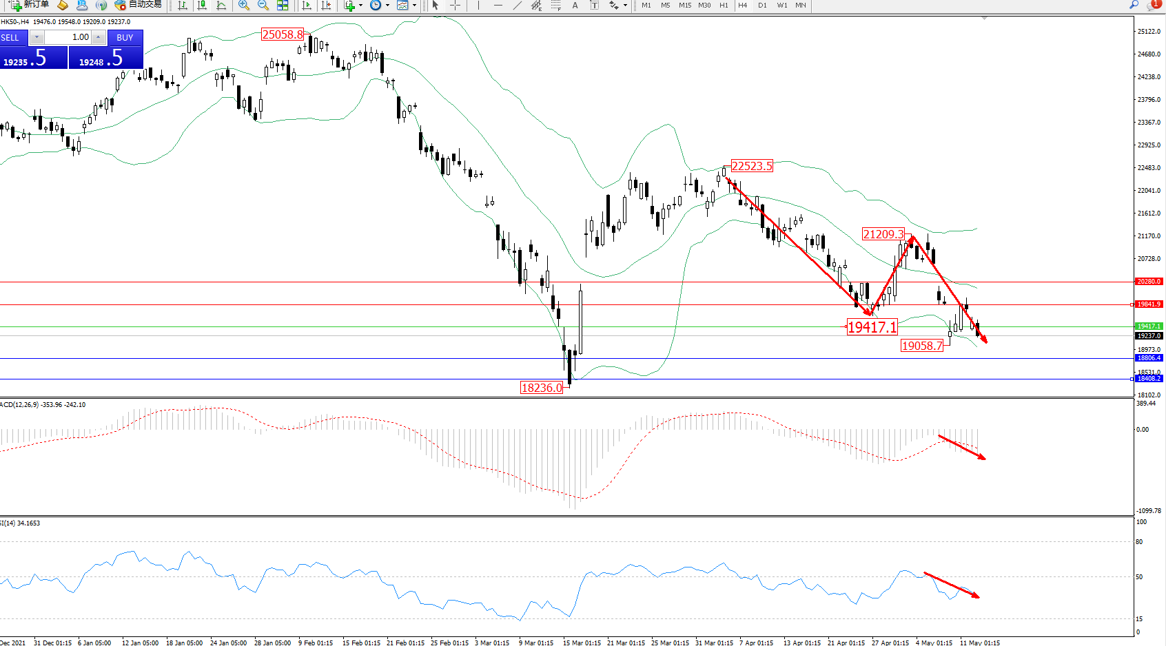 香港恒生指数5月12日(周四)收盘下跌444.23点,跌幅2.24%,报19380.34点;港股再度大跌,恒生科技指数跌3.84%,再度失守4000点。大型科技股继续引领大市走低,京东跌近8%,阿里巴巴跌6.6%,小米、百度跌超5%,腾讯跌近2%;美延续高通胀,美元走高非美货币下跌,市场担忧加剧。美国总统拜登称通胀仍高得令人无法接受,降低通货膨胀是他的首要经济任务;货币市场计价美联储加息力度增大。