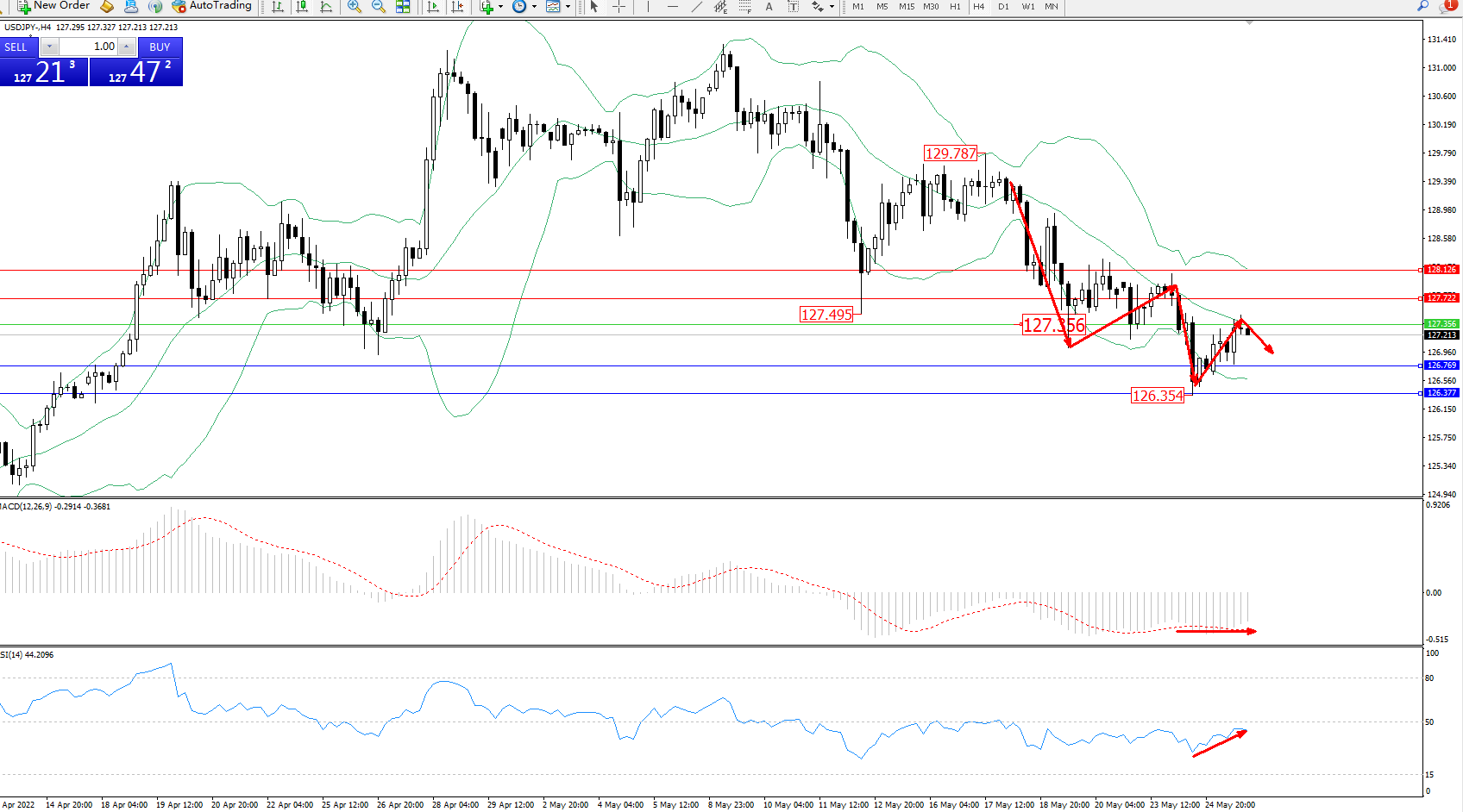 技术点评:空头力度延续布林带指标通道中下轨区间窄幅整理缓慢下行,低位抵达126.354附近节点后反转上移,触及中轨附近节点后有继续下行迹象,布林带指标呈空头动力不断震荡向下移动中,MACD指标处于空头区域低位维持整理,RSI指标处于50均衡线下侧维持弱势徘徊中;