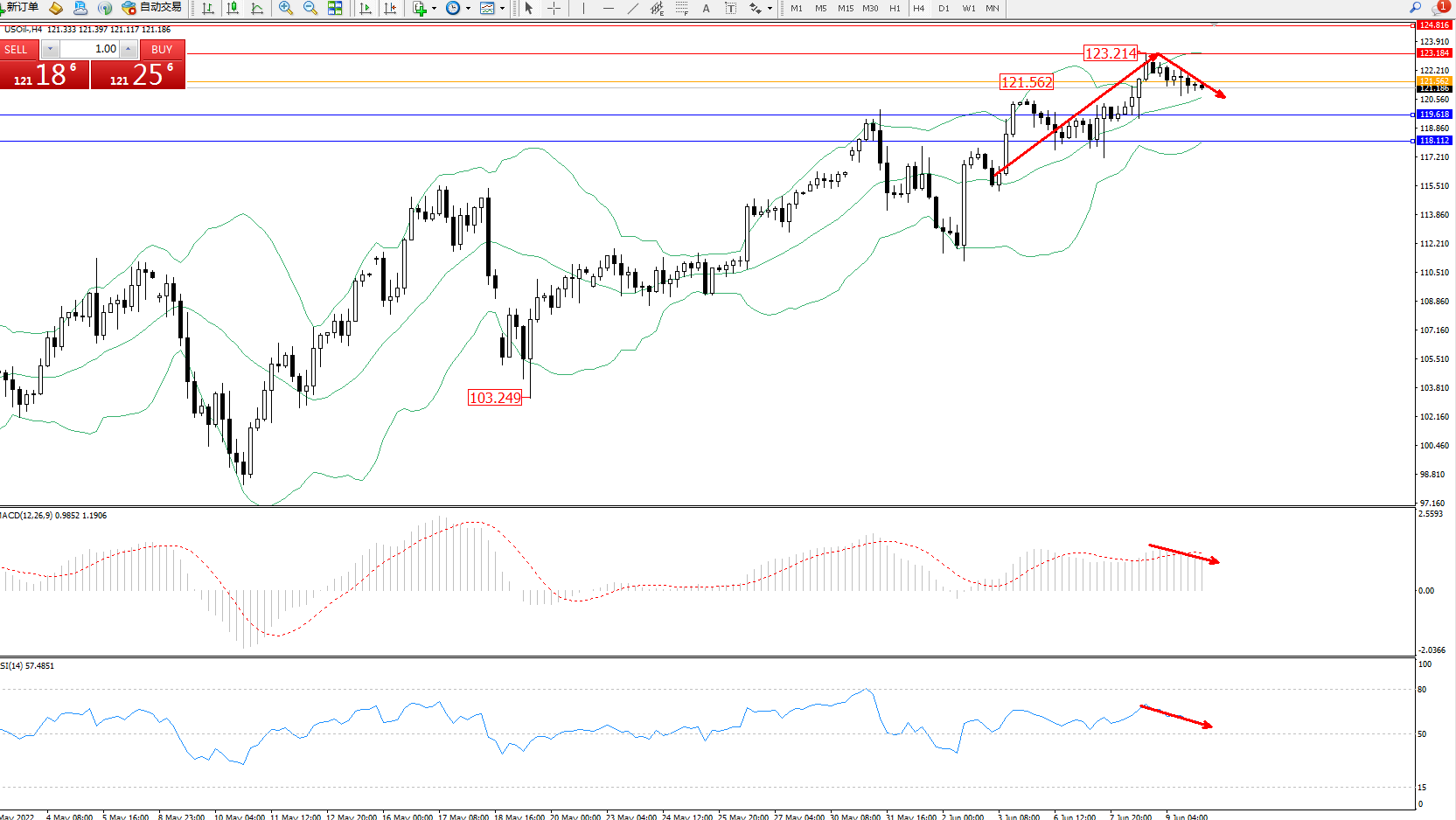 技术点评:多头动力延续布林带指标通道中上轨区间持续震荡上扬,高位抵达123.214附近震荡整理,短期空头动力开始高位徘徊,布林带指标呈上行趋势上移后开始缓慢收口,MACD指标处于多头区域维持整理平移,RSI指标处于多头区域维持整理后缓慢下行;