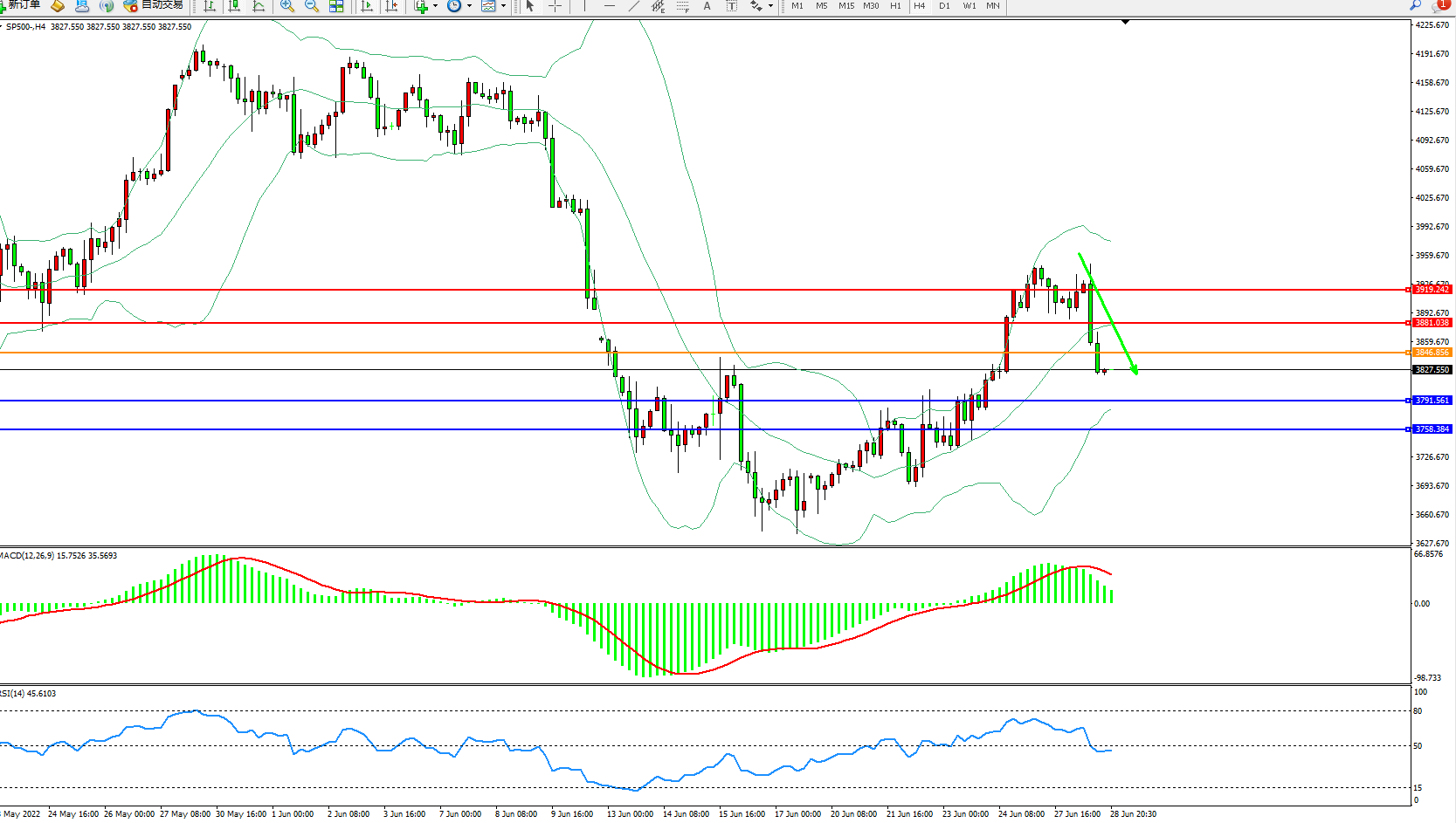 标普500指数6月28日(周二)收盘下跌78.81点,跌幅2.02%,报3821.30点;标普经济学家预计美国经济今年将增长2.4%,但物价和利率的上涨可能会使美国经济在2023年陷入衰退。消费者弹性带来的经济势头可能会维持今年的经济稳定,但持续的高物价和激进的加息将对明年的经济增长构成压力。