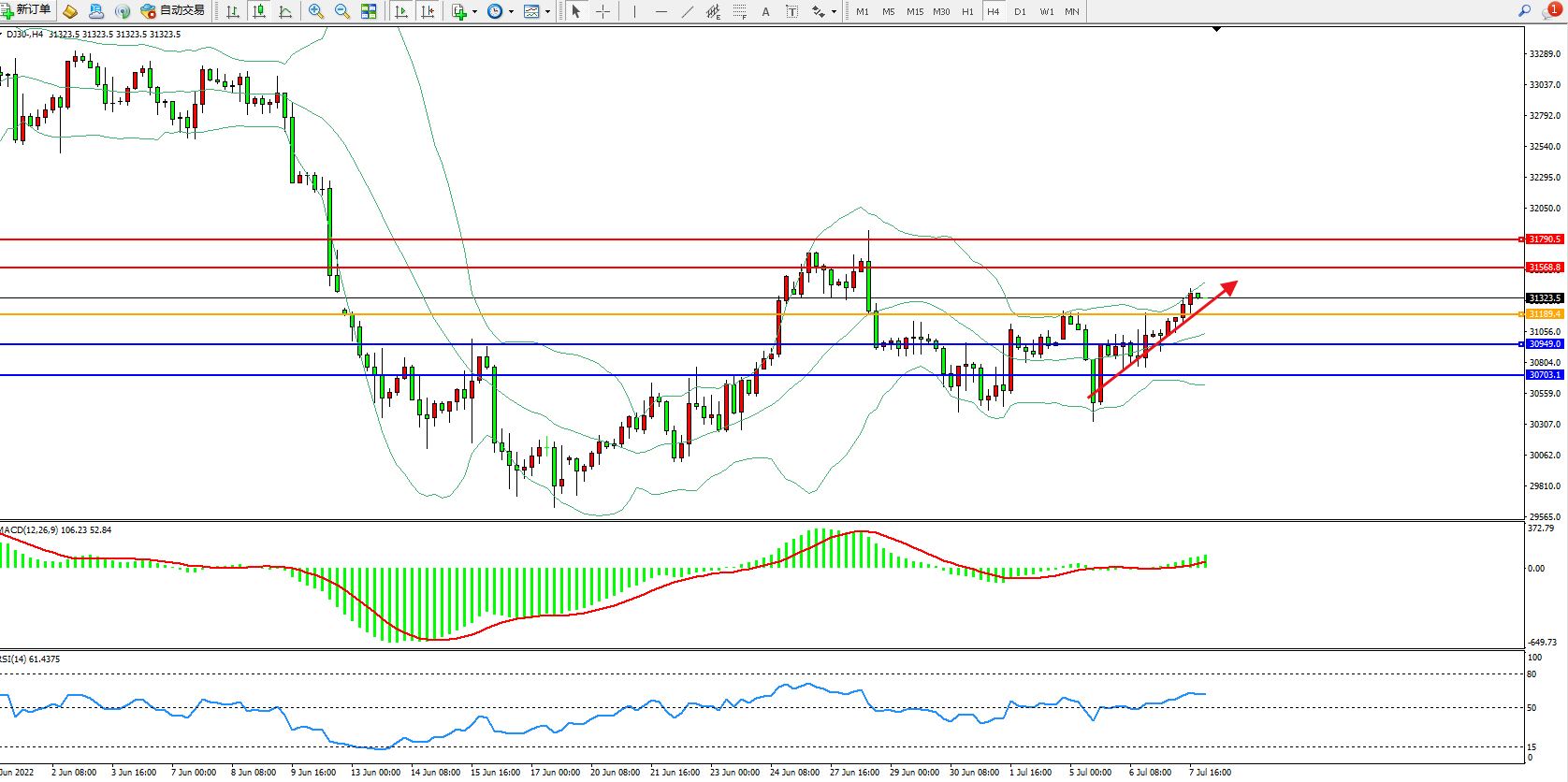 4小时图看:多头动力延续布林带指标通道中上轨区间持续震荡上扬,布林带指标呈缓慢张口走势持续,MACD指标处于0轴线上側徘徊,RSI指标出50均衡线上側窄幅整理;