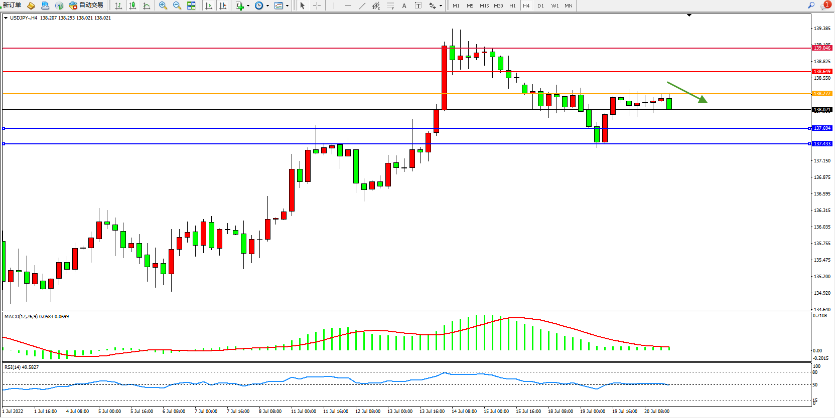 交易策略:138.277下方看跌,目标137.694、137.433