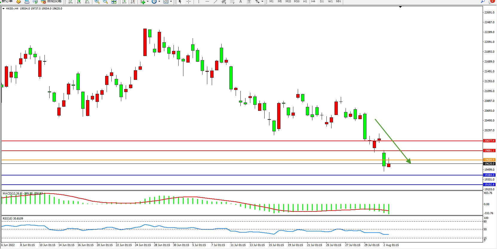 香港恒生指数8月2日(周二)收盘下跌476.63点,跌幅2.36%,报19689.21点;受地缘政治紧张影响,全球金融市场下挫,港股全天维持下跌行情,恒指跌2.36%失守20000点大关,恒生科技指数跌3.01%再度下破4200点,二者均创阶段新低。根据飞行航班信息平台FlightRadar24显示,据信是美国众议院议长佩洛西此前搭乘的C-40C专机(呼号SPAR19)于北京时间8月2日15时50分左右从吉隆坡机场起飞,目的地未知。目前不清楚佩洛西是否在这架飞机上。