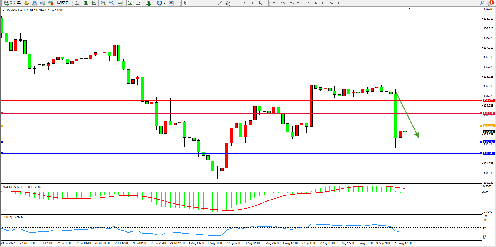 4小时图看:市场空头动力急速下挫,短期下行态势良好,前期低位近在咫尺破位在即,MACD指标处于高位空头震荡下行至0轴线下侧徘徊,RSI指标处于50均衡线下侧窄幅整理;