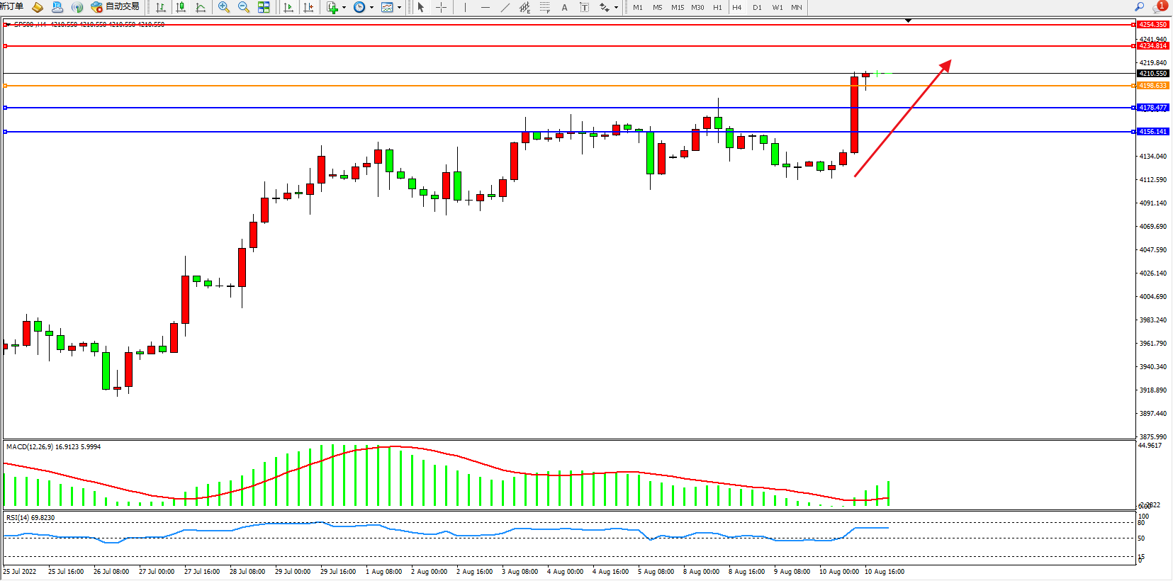 标普500指数8月10日(周三)收盘上涨86.53点,涨幅2.10%,报4209.00点;美联储主席鲍威尔:物价上涨的步伐正在放缓,但还没有显示出足以让美联储放弃收紧货币政策的下降趋势。