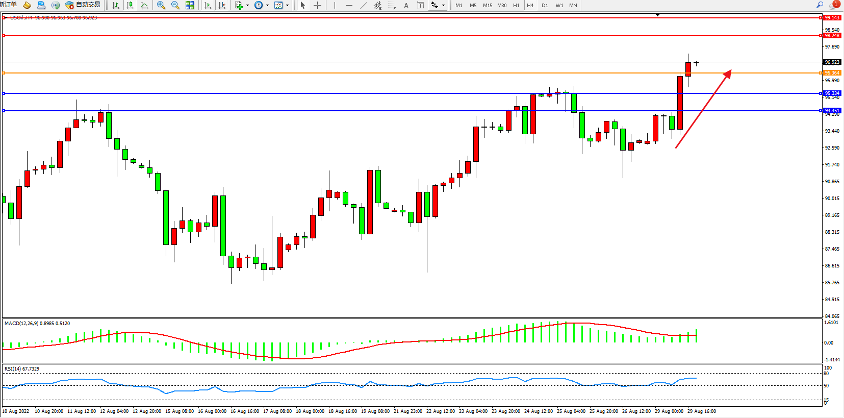 4小时图看:低位多头动力维持震荡拉升,短期高位有继续向上移动态势,市场看涨情绪态势良好,MACD指标处于0轴线上行弱势整理,RSI指标处于50均衡线上側震荡;