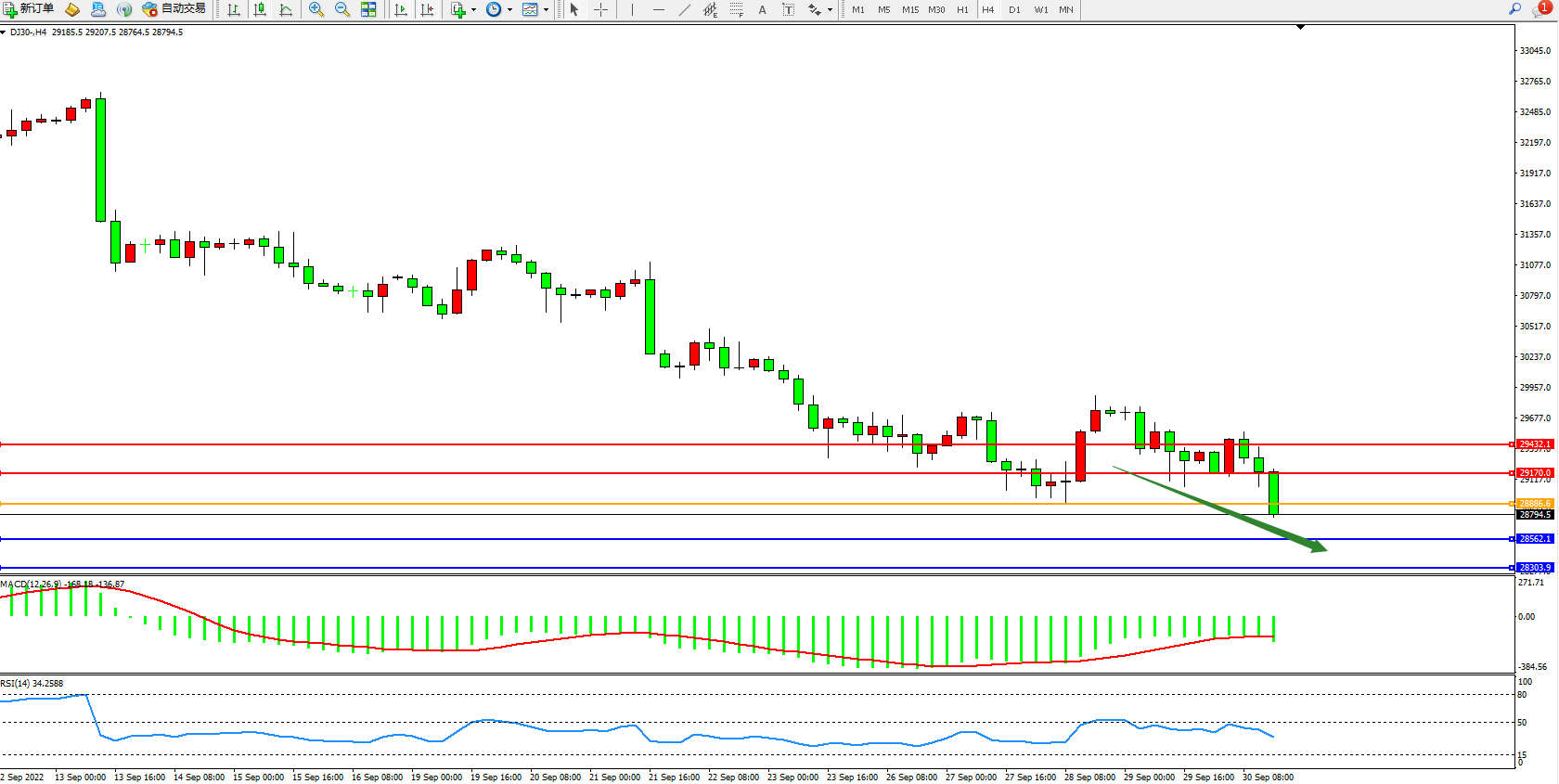 道琼斯指数9月30日(周五)收盘下跌495.49点,跌幅1.70%,报28730.12点;华尔街螺旋式的下跌如今正在滚雪球般的迫使资产平仓。包括美国股票、存托凭证和房地产投资信托在内的纽约证交所综合指数已跌破多个技术支撑位,亏损累积可能迫使基金出售更多资产以筹集现金,令抛售加速。在恐慌性抛售迫使央行干预之前,维持战术性看跌观点。