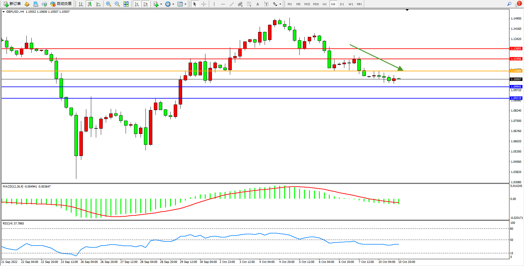4小时图看:高位空头动力维持弱势整理下移,市场空头下移走势持续,短期有迹象继续下移态势,MACD指标处于0轴线下侧弱势徘徊,RSI指标处于50均衡线下侧弱势整理;