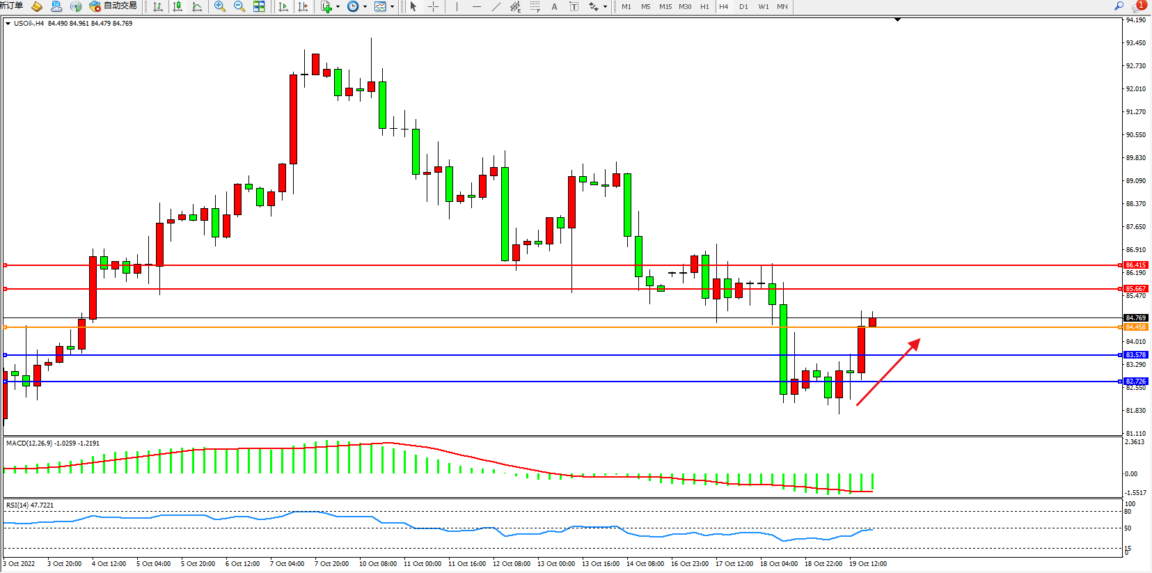 原油维持84.769附近震荡,美国EIA公布的数据显示,截至10月14日当周美国除却战略储备的商业原油库存意外下降低于预期,为1984年6月1日当周以来最低。