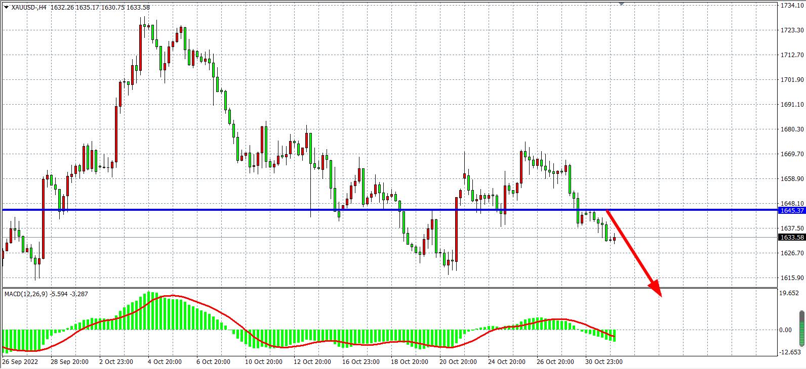 1小时图看,金价在在跌破1640后继续加大回调力度,盘中一度跌至1630附近,目前跌势扩大阻力下移,最新压力位已下移至1645,同时MACD于零轴之下持续放量,预示行情面临进一步回调风险,日内在1645之下继续看跌,下方目标1630-1615。