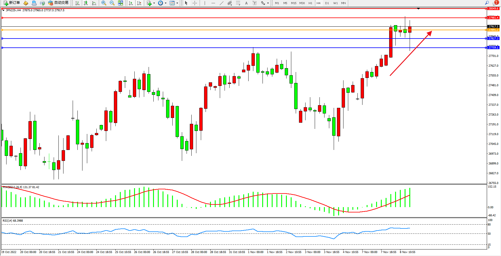 日经225指数11月8日(周二)收盘上涨344.86点,涨幅1.25%,报27872.50点。日本内阁将批准一项1980亿美元的额外预算,为旨在缓解通胀对个人和企业影响的经济刺激计划提供资金。截至今年3月的第二次补充预算的部分资金将来自22.9万亿日元的政府债券发行。