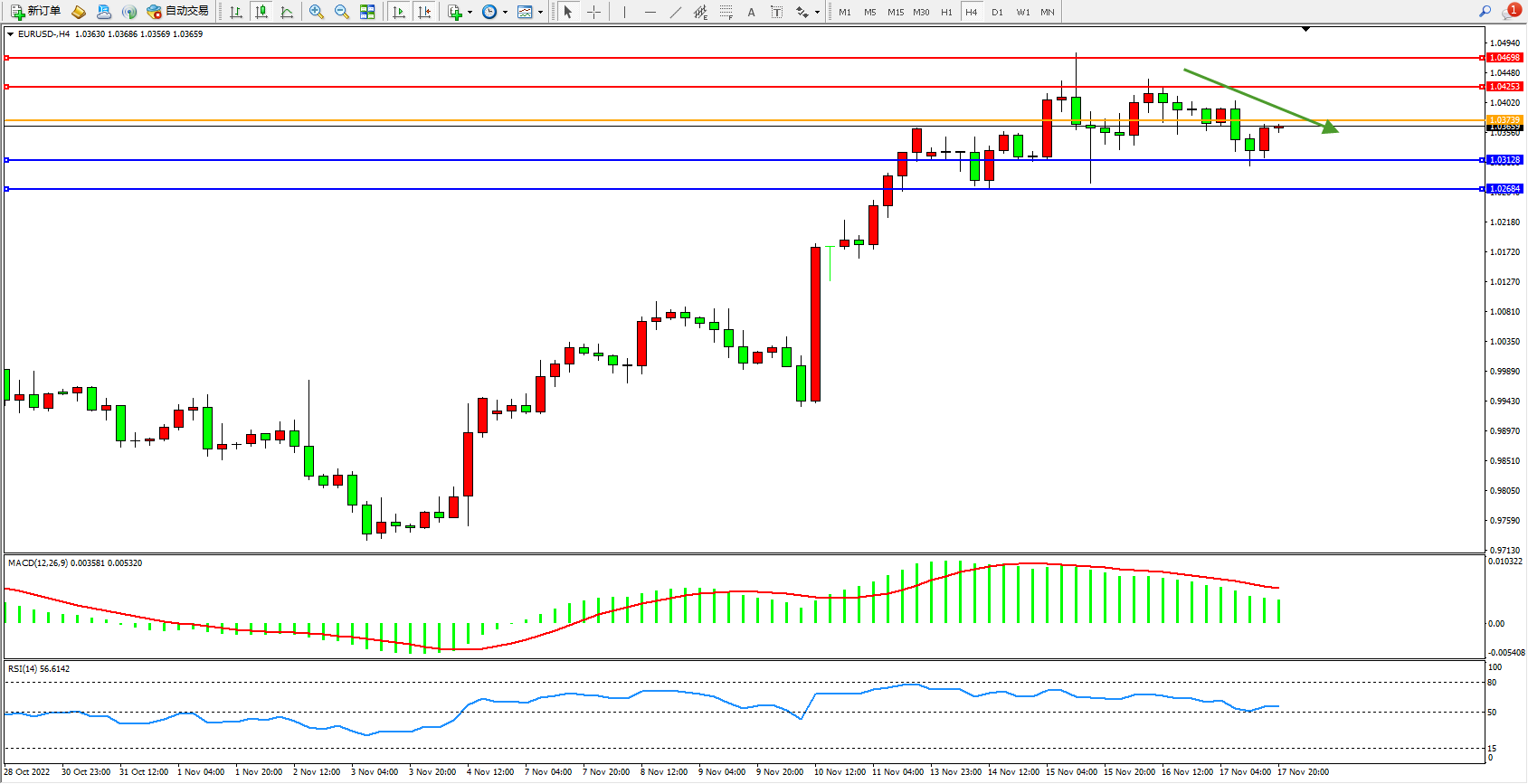 欧元兑美元维持1.03655附近震荡,欧元区10月CPI年率终值 10.6%,预期10.70%,前值10.7%。为纪录以来新高,初值为10.7%。欧元对美元在隔夜外汇市场上曾上涨超1.50%,盘中最高曾触及1.0482,这是近两个月以来首见高位。