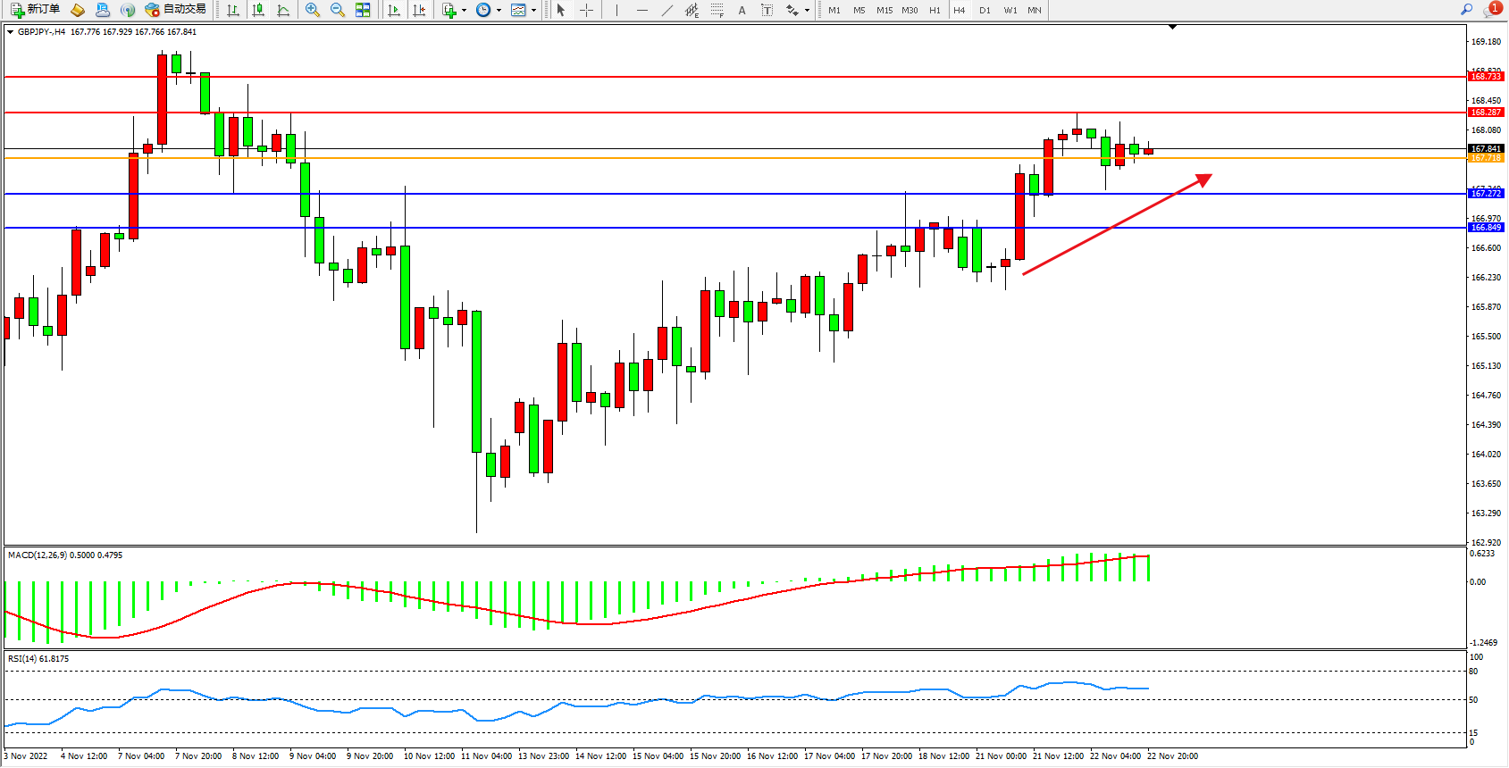 英镑兑日圆维持167.841附近震荡,在英国经济前景黯淡、英国央行立场更为鸽派的情况下,预计英国将出现长期衰退,英国政府在其秋季报告中公布的财政整固方案加强了这一预测。