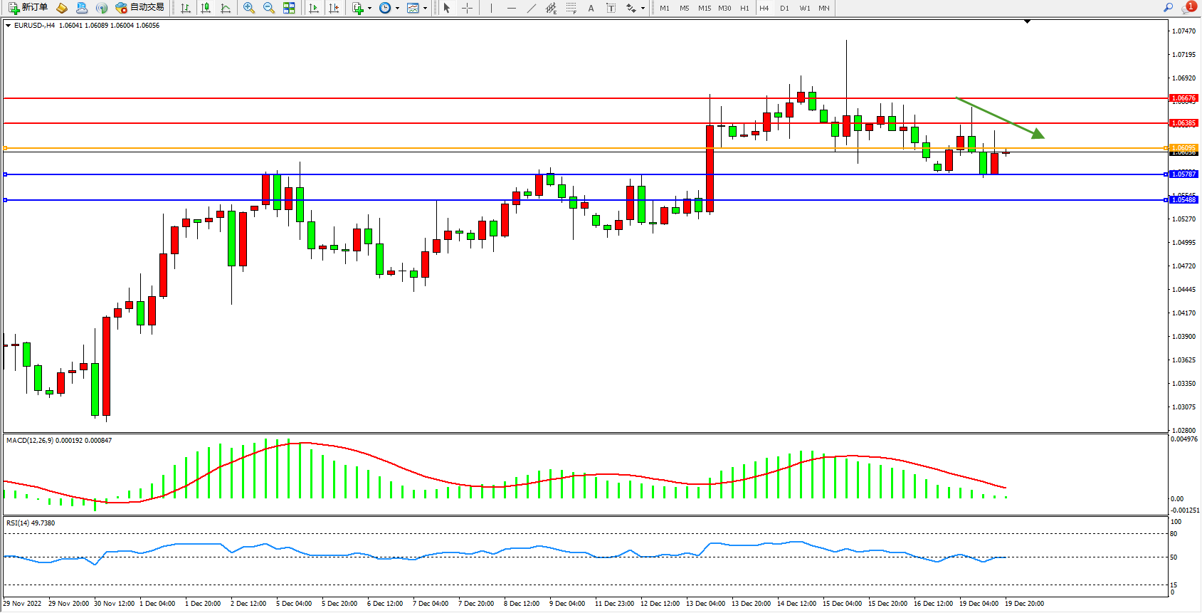 欧元兑美元维持1.06054附近震荡,投资者担忧美联储可能在明年继续加息导致经济衰退的风险,欧央行承诺继续大幅加息,同时公布量化紧缩计划,市场认为,欧央行要比美联储更晚结束加息。