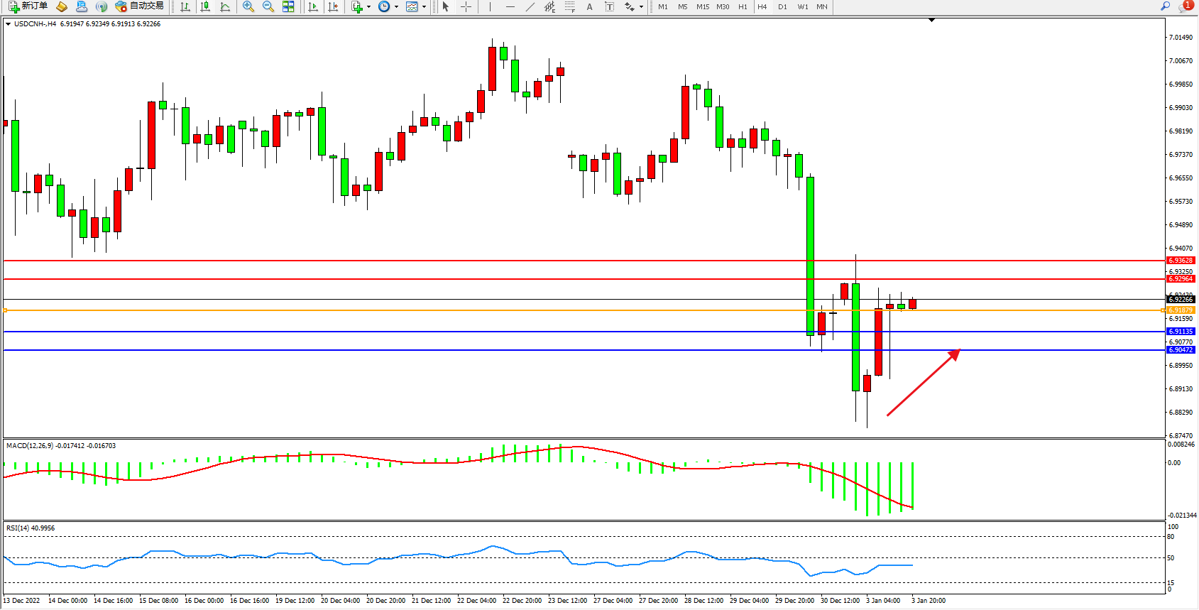 美元人民币USDCNH——4小时K线图显示: