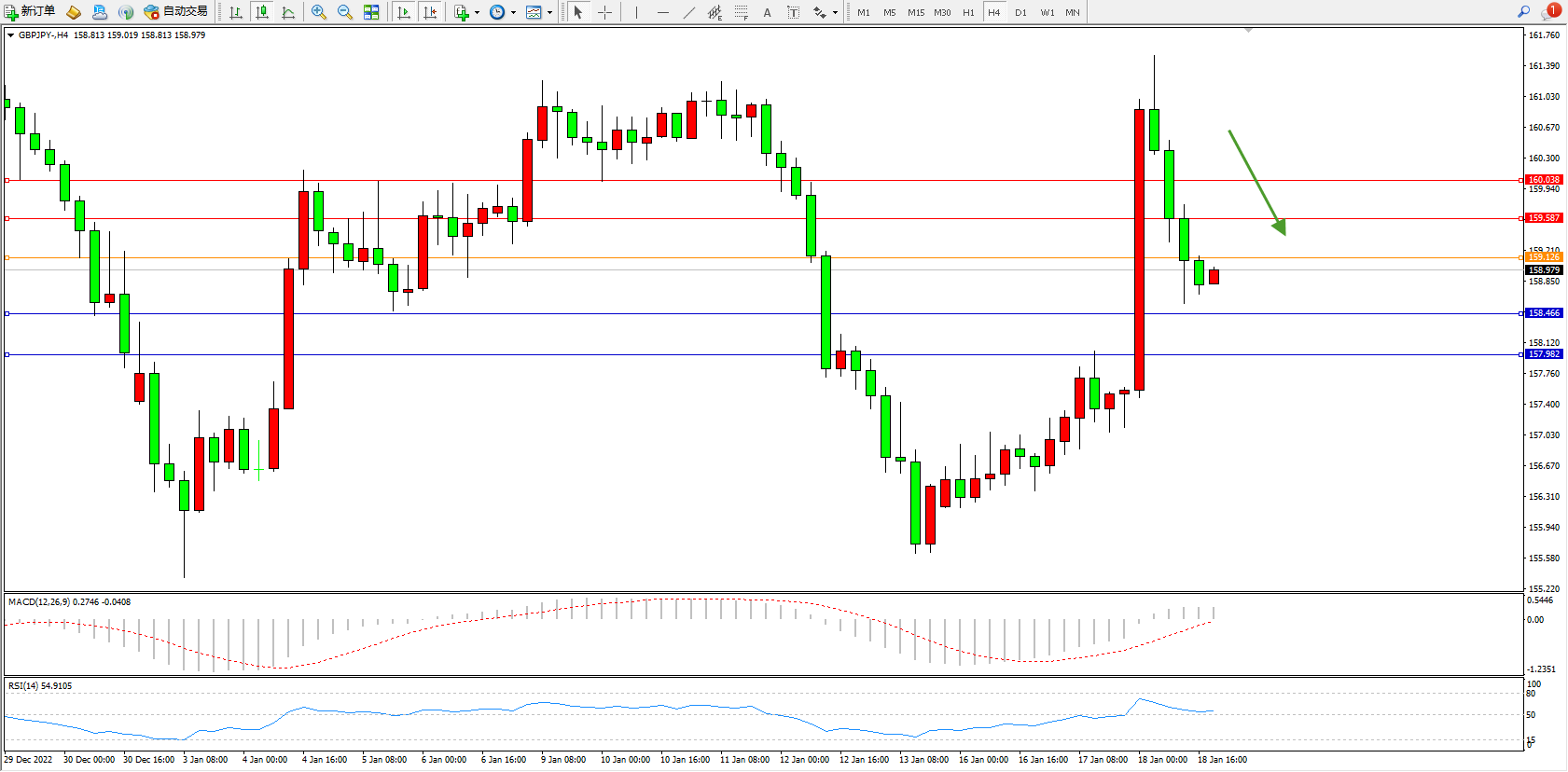 交易策略:159.126下方看跌,目标158.566、157.982