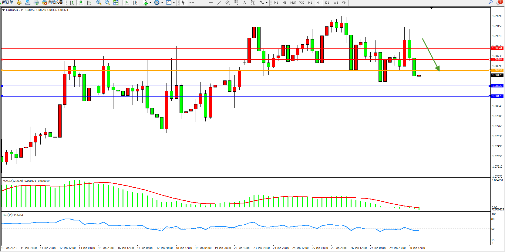 交易策略:1.08533下方看跌,目标1.08320、1.08178