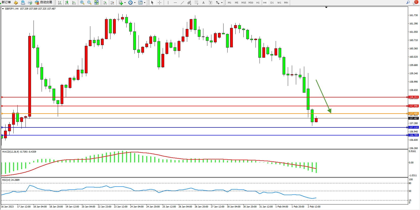 交易策略:157.680下方看跌,目标157.110、156.789