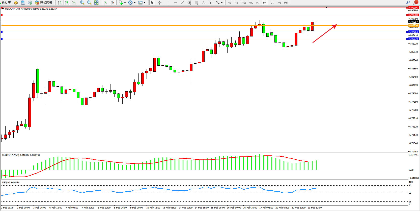 交易策略:6.88794上方看涨,目标6.90288、6.91306