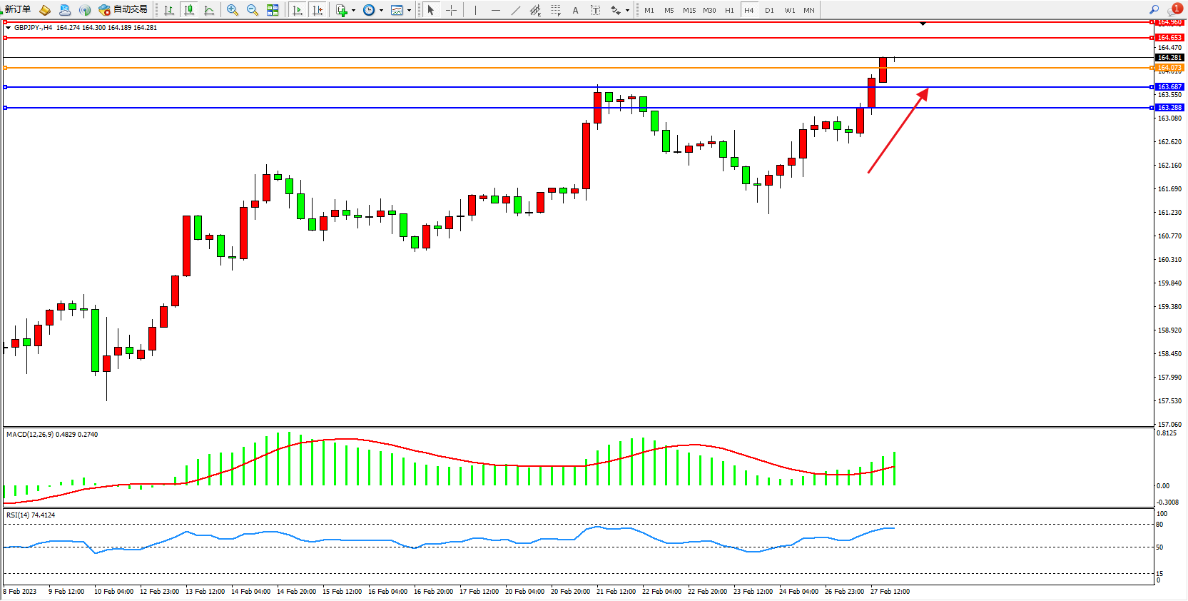 4小时图看:高位多头动力强势拉升,市场多头情绪涌现,市场整体处于看涨情绪,MACD指标处于多头区域持续上移,RSI指标处于多头区域持续上行;