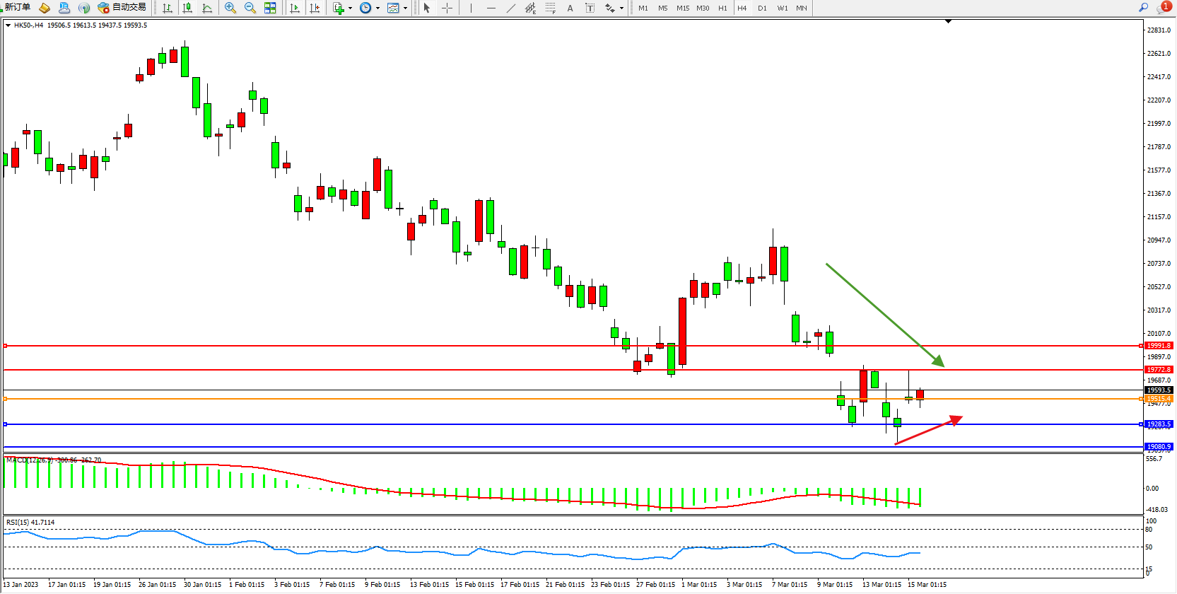 香港恒生指数3月15日(周三)收盘上涨291.91点,涨幅1.52%,报19539.87点;美银行股昨晚大反攻促市场情绪回暖,港股三大指数全天维持上涨行情,恒生科技指数涨2%,恒指、国指分别涨1.52%和1.88%。大型科技股强势支撑大市回升,大基建股再度活跃,中字头股表现亮眼,表现强势的黄金股熄火,南下资金净流入62.14亿港元,大市成交额为1080亿港元。