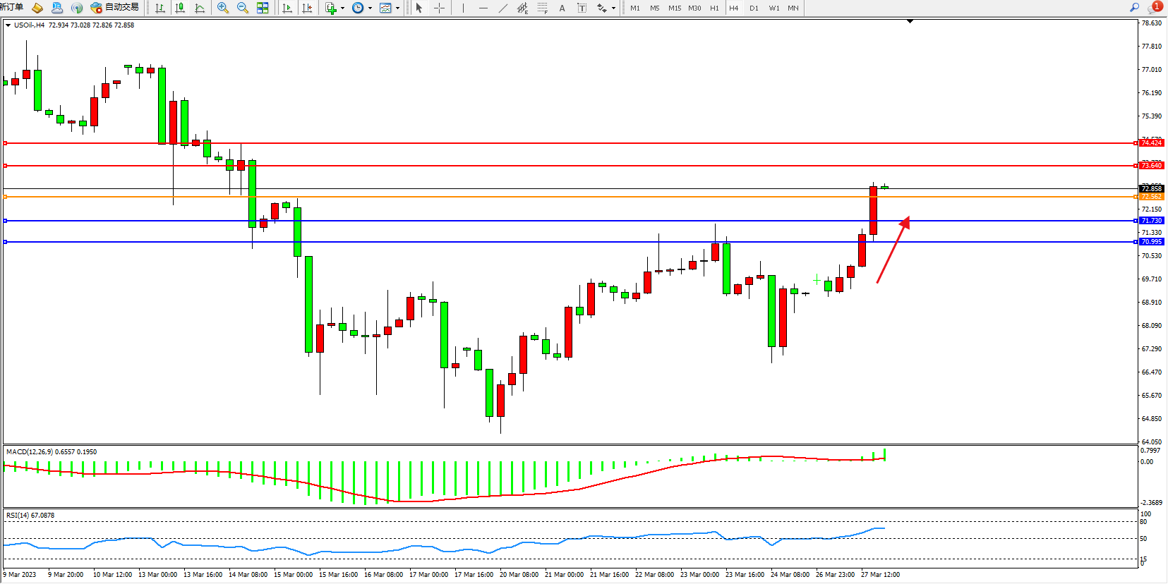 原油维持72.858附近震荡,石油交易者正在密切关注金融市场的情绪,而石油基本面仍处于多空拉锯状态。在(银行业)危机完全消散之前,油价不会出现强劲反弹。这可能需要经历数天甚至数周时间。