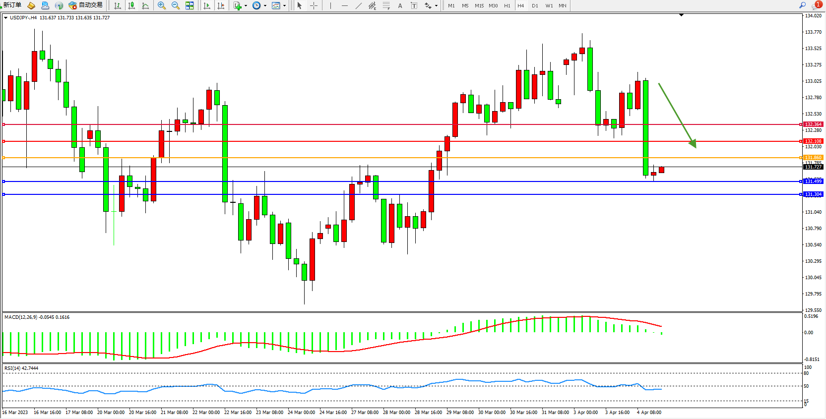 4小时图看:空头动力急速下挫,短期跌势或将延续,市场整体处于空头下行走势中,MACD指标处于0轴线附近徘徊,RSI指标处于50均衡线下侧弱势整理;
