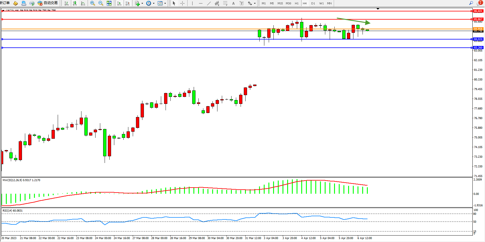 布油维持84.798附近震荡,两大市场本周迄今均上涨近6%,因石油输出国组织和包括俄罗斯在内的盟友(OPEC+)上周末意外宣布新的减产116万桶/日。但因受到疲软的经济数据吹来的逆风,原油涨势近两个交易日暂停。