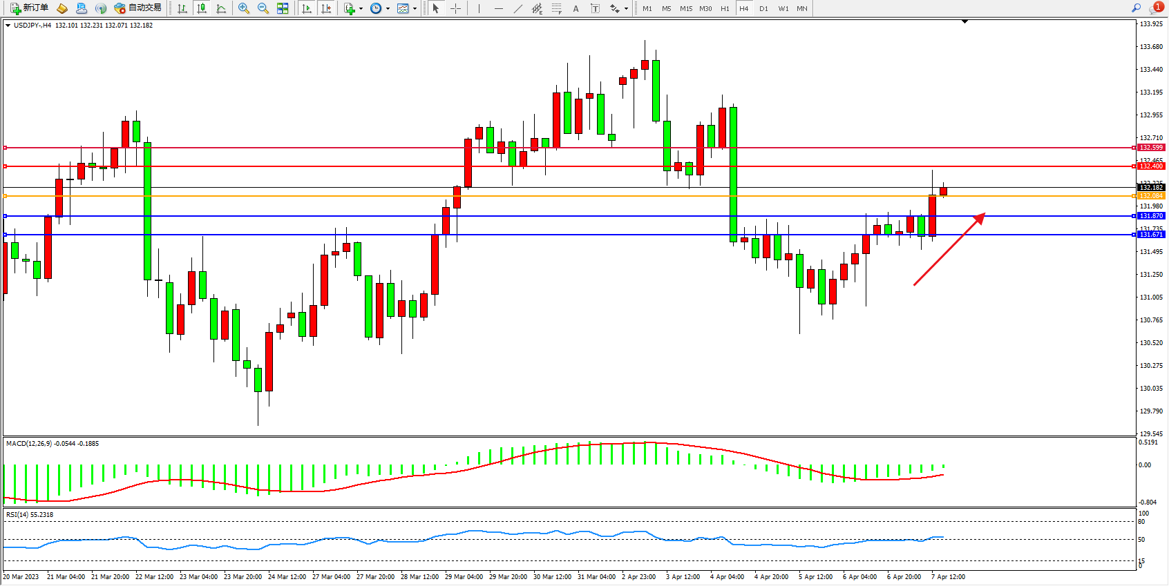 4小时图看:市场多头动力维持震荡上移,短期看涨情绪持续,多头有继续攀升迹象,MACD指标处于空头区域整理上移至0轴线附近徘徊,RSI指标处于50均衡线上側弱势整理;