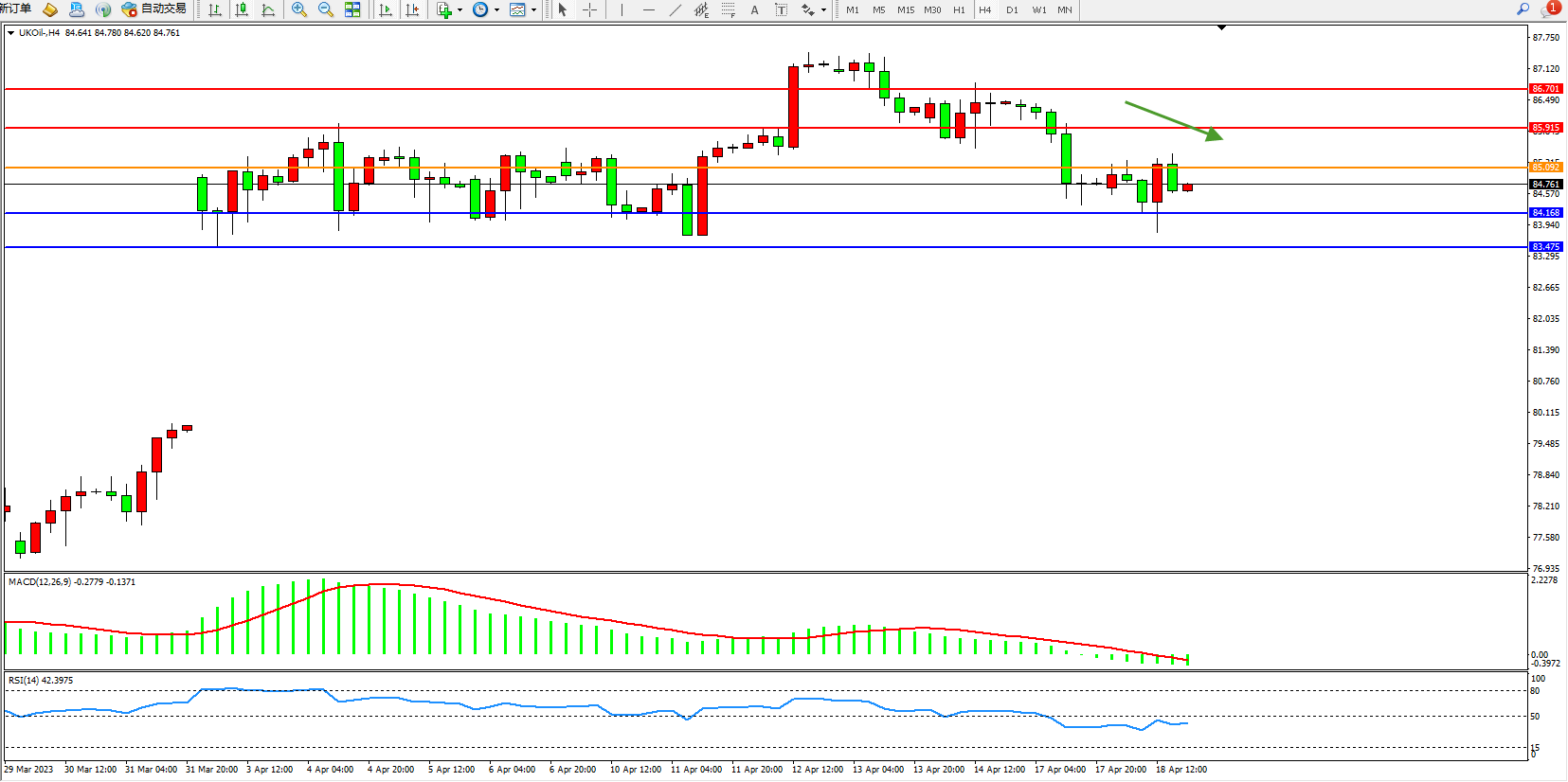 4小时图看:高位空头动力维持震荡向下移动,短期跌势或将持续,市场高位空头情绪开始逐渐加大,MACD指标处于0轴线下侧徘徊,RSI指标处于50均衡线下侧弱势整理;